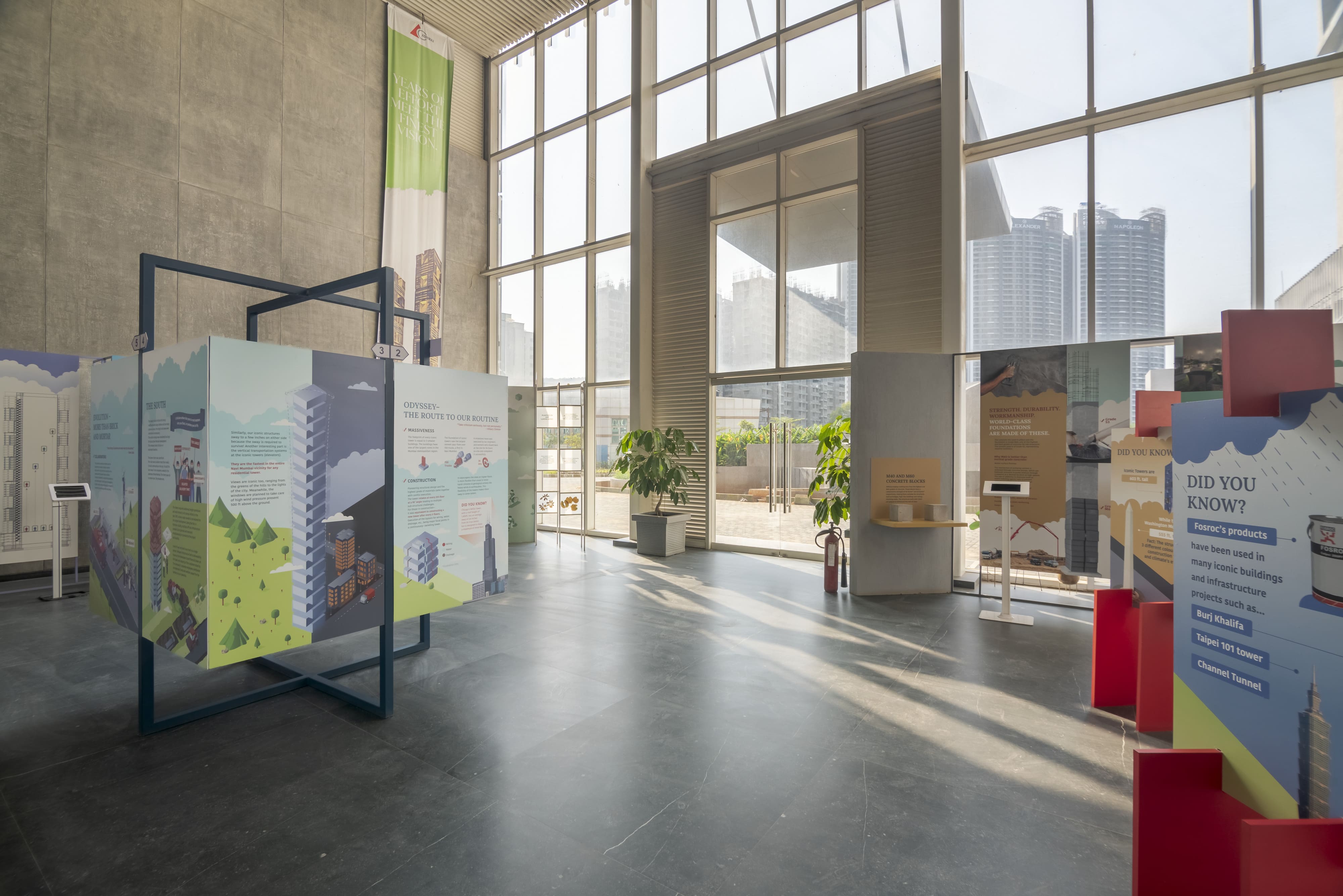 Inspired by the swivel form of Capital Tower by Adhiraj, the exhibition concept translated architectural geometry into a spatial and graphic system. The narrative connected material truth, construction methodology and brand values into a cohesive experiential journey.