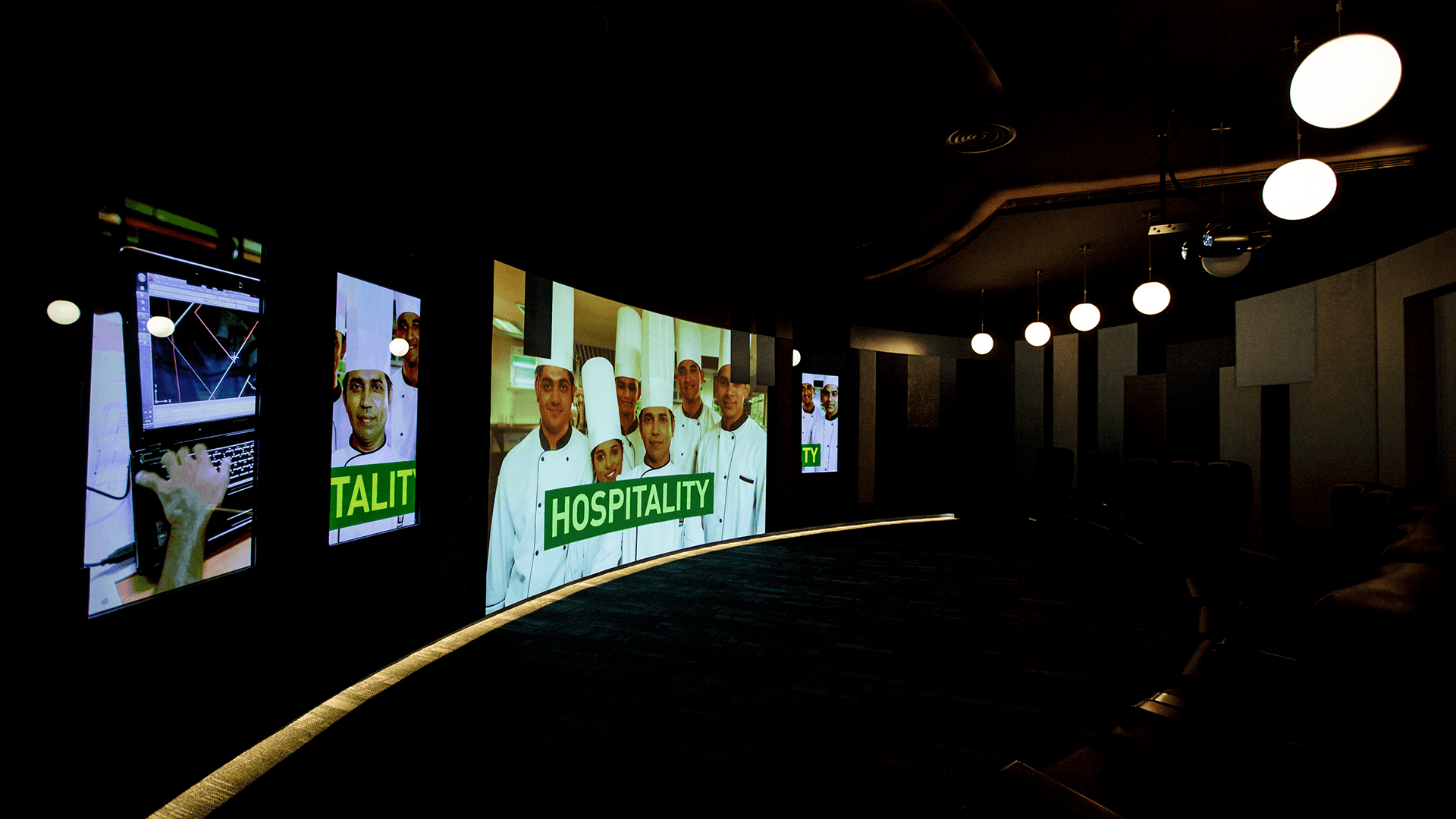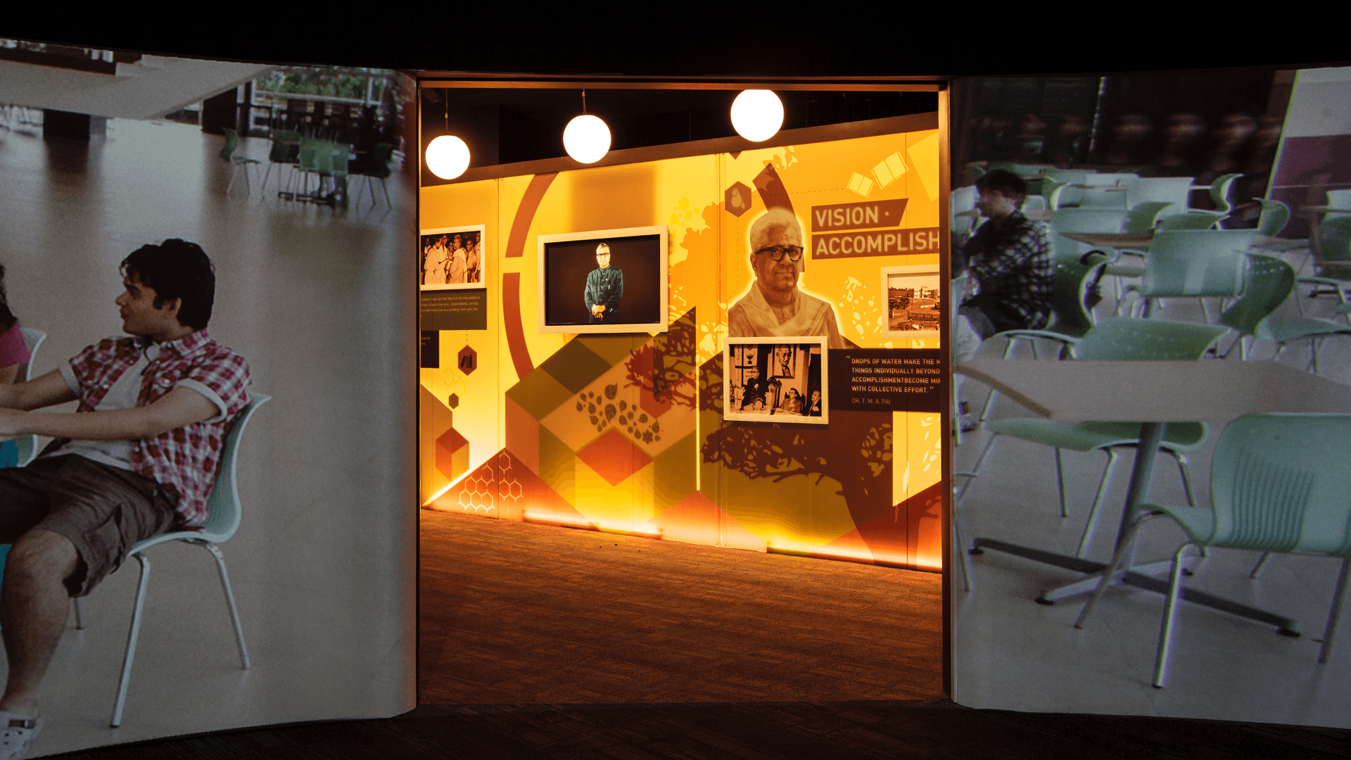 We designed a surround audio-visual experience built on a strong central storyline which unfolds progressively, guiding visitors through MAHE’s evolution, present-day excellence and global relevance. The experience opens into a high-impact multimedia show, drawing visitors into a virtual journey through the university’s facilities, international programmes, social dimensions and campus life.