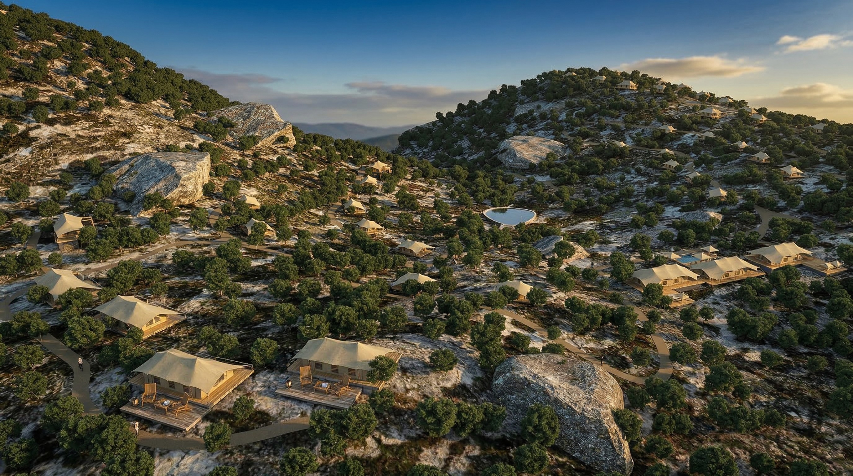 EuMo approached the site as a continuous experiential landscape rather than a collection of buildings. The masterplan was organised around a central bowl anchoring shared amenities like reception, lounge, dining, bar and pool creating a social heart that oriented guests upon arrival.
