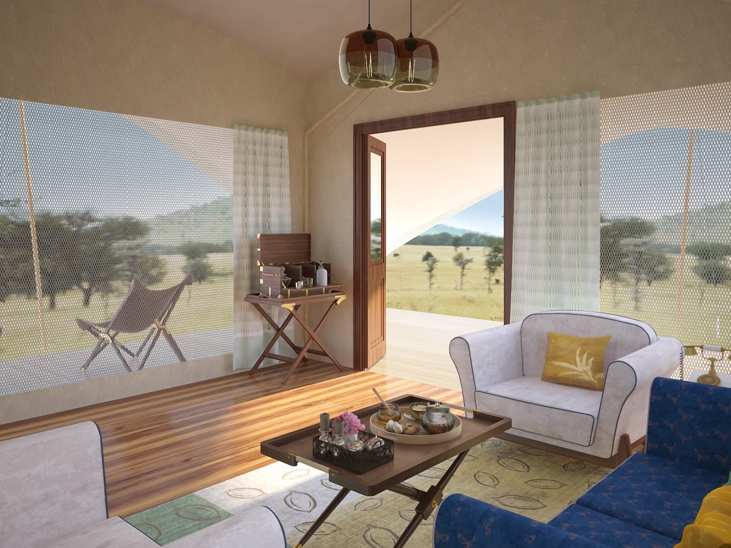 Safari-era campaign furniture inspired the aesthetic, reinterpreted through contemporary detailing and materials to meet modern luxury expectations. Each element, like the beds, seating, storage and outdoor furniture, was designed to enhance comfort while reinforcing the immersive safari experience as a cohesive whole.