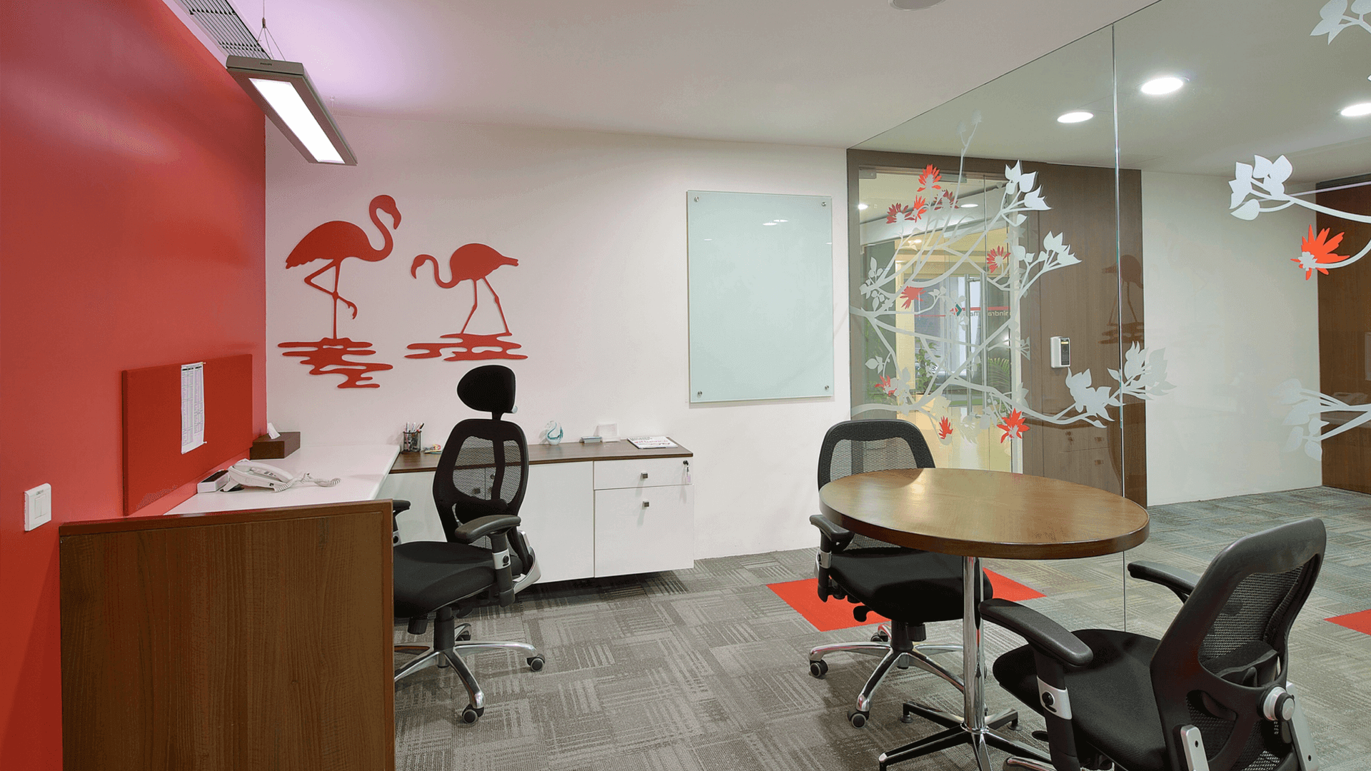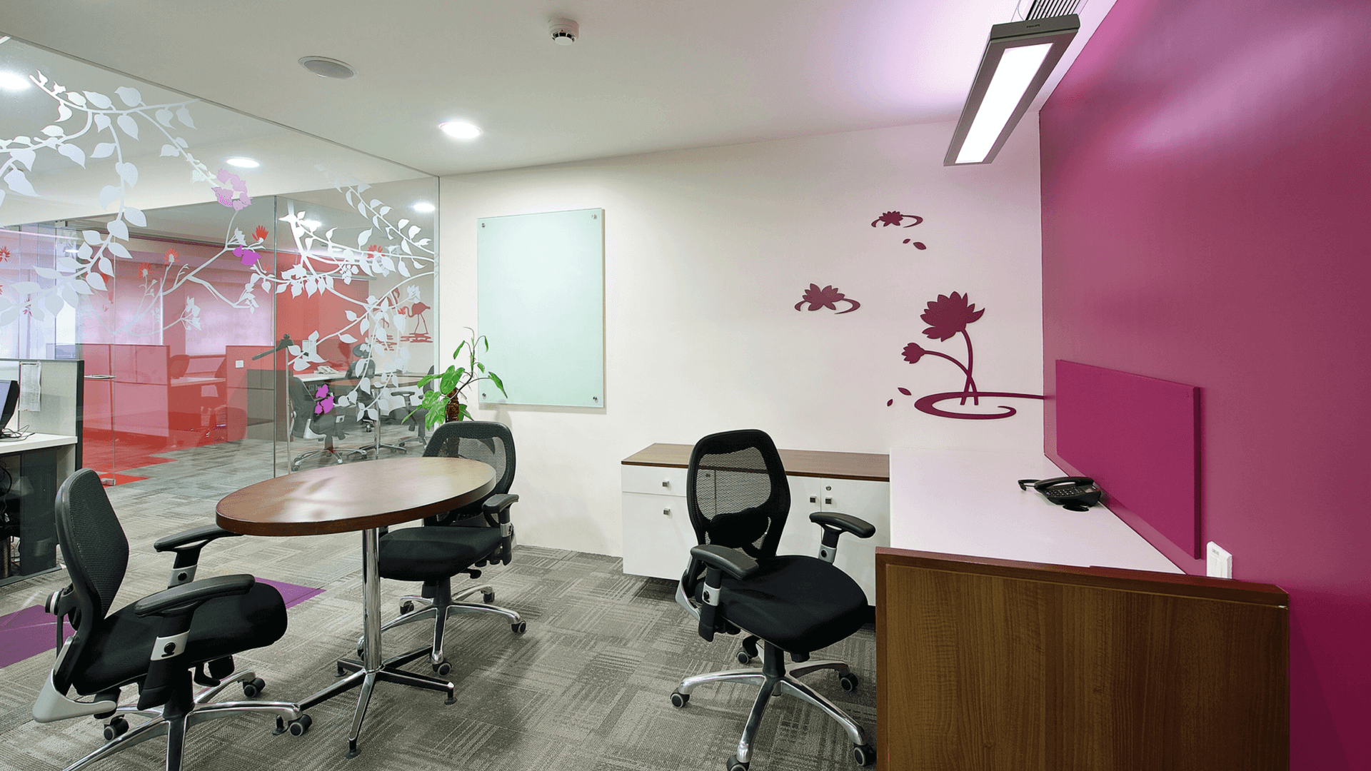 For office staff who work entire shifts with images of holiday locations, and are besieged with pictures of families at Club Mahindra resorts on all their digital devices and social media, we felt it would be an overkill to add posters and images on the walls. Instead we elected to create a more evocative style that brings in the serenity of nature and the vibrancy of colour that speaks to their brand without being overwhelming.