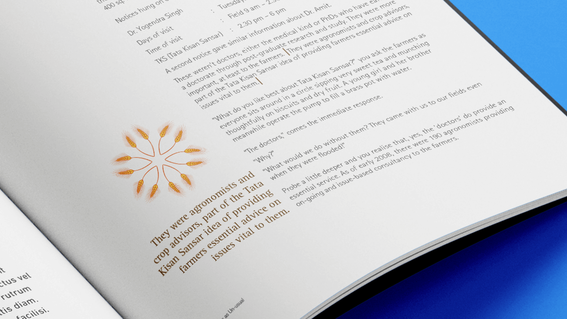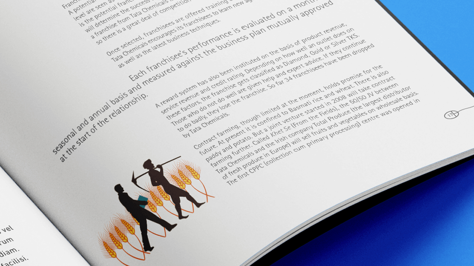 The work that the Tata group has done within communities is invaluable. These are true stories of grit and determination to protect natural habitats and improve the lots of marginalised communities. We worked with the group and story-tellers to capture these as easy-read stories. Photographs did not do justice to the efforts, in most cases taken low-resolution and in many cases absent. We decided we would tell graphic stories alongside the written word, tessellating the graphic storytelling across pages with new elements.